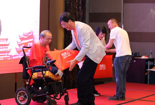 愛心企業(yè)——路路通塑業(yè)的唐董事長為殘疾人朋友頒發(fā)愛心禮包。
